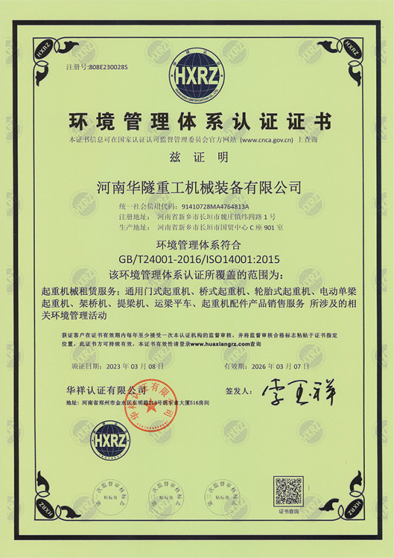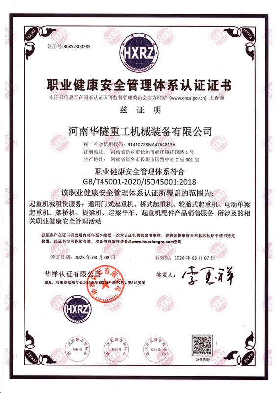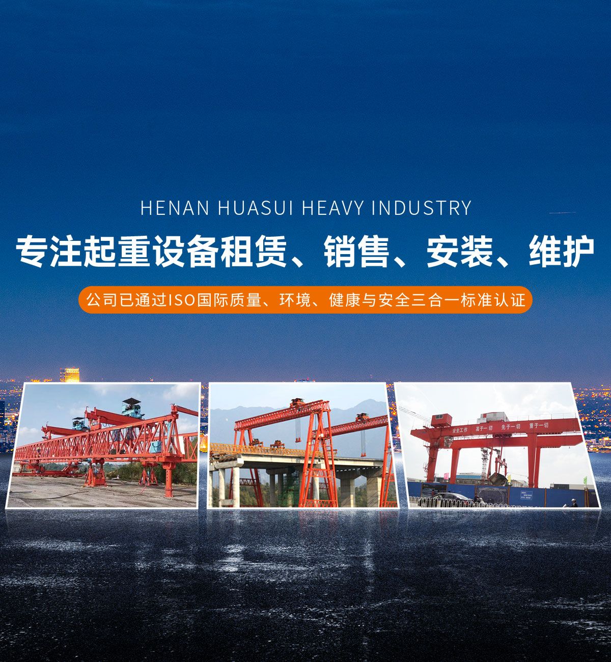 河南華隧重工機械裝備有限公司主要從事通用門式起重機、橋式起重機、電動單梁起重機,輪胎式起重機、架橋機、提梁機、遠梁平車、鋼絲繩電動萌蘆、卷揚機、起重配件制造、銷售:起重機械租賃、安裝和維修,起重設備園收,機械設備維修,鋼結構工程承包,橋梁工程及技術咨淘服務,銷售五金制品、機電設備:建設工程監理,建設工程設計,各類工程建設活動,建筑勞務分包,建筑物折除作業,施工作業,工程管理服務,土石方工程施工,裝如發運。  公司已通過IS0國際質量、環境、健康與安全三合一標準認證,特種設備制造許可證和特種設備安裝改造維修許可證。擁有完熟的質量管理體系。嚴格的管理制度,強大的生產能力和先進的檢測手段,在保證產品質量的同時,也具備了極強的市場競爭力?! 」緢猿挚萍紕撔聻槔砟睿a品質量為核心,注重信譽,建立了減信可靠、快捷、思速。便利周到的售后服務網絡?! ∥覀儞碛械募夹g專家和技術服務隊伍為客戶提供充善的售前技術支持和全天候的售后服務體系,讓您無后顧之憂,享受一站式的超值服務。  “華隧重工,伴您成功“是華隧重工永遠的宗指,真被的希望與各界朋友攜手并進。共創輝準!